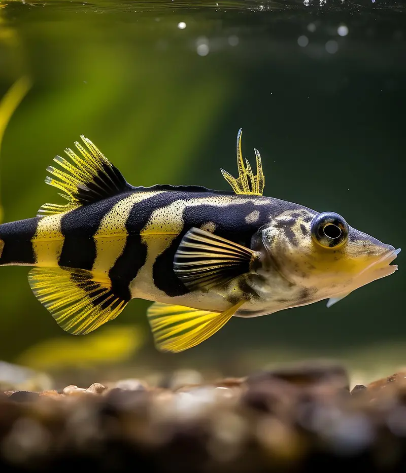Bumblebee Catfish scientifically called Pseudopimelodus Nigrita is a small species of catfish that is known for their lively coloration and appearance. They have a bright yellow or golden body with bold black lines. The coloring is like that of a bumblebee, hence giving them this name.