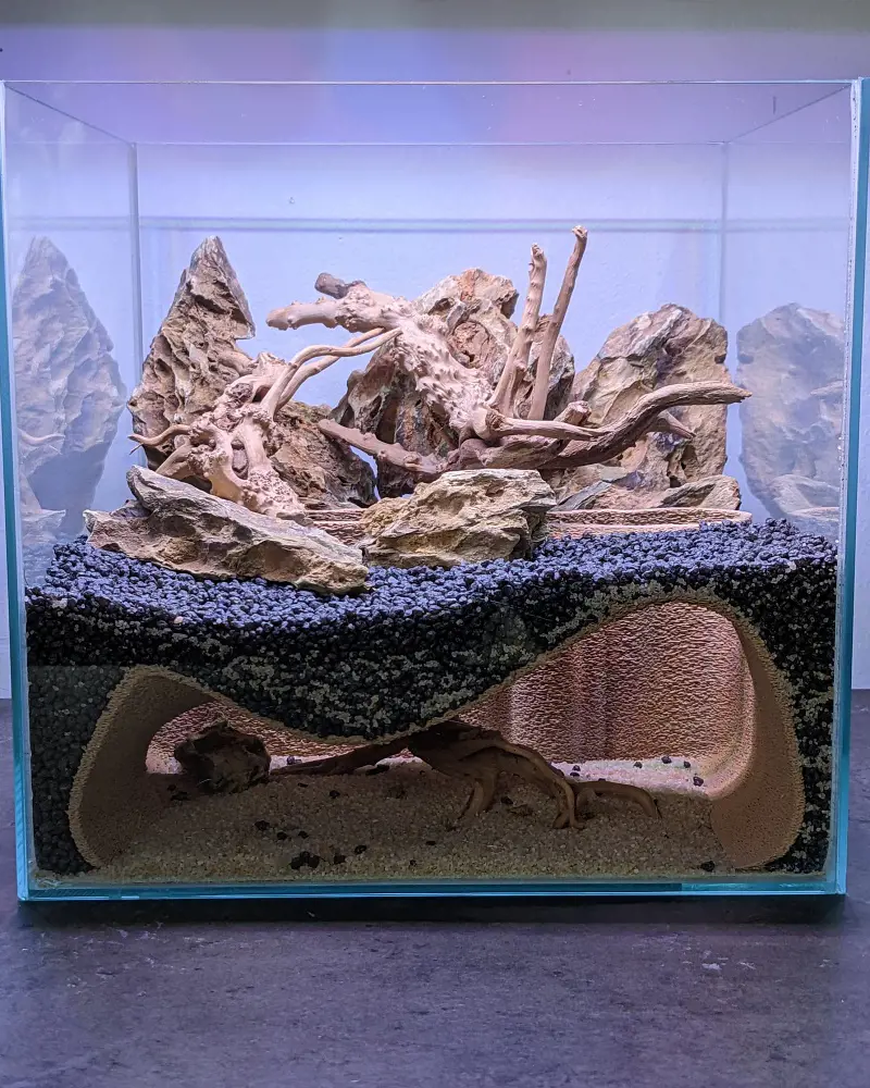 In the fish tank, you can add cave-like structures and arrange them creatively to form a network of interconnected caves.