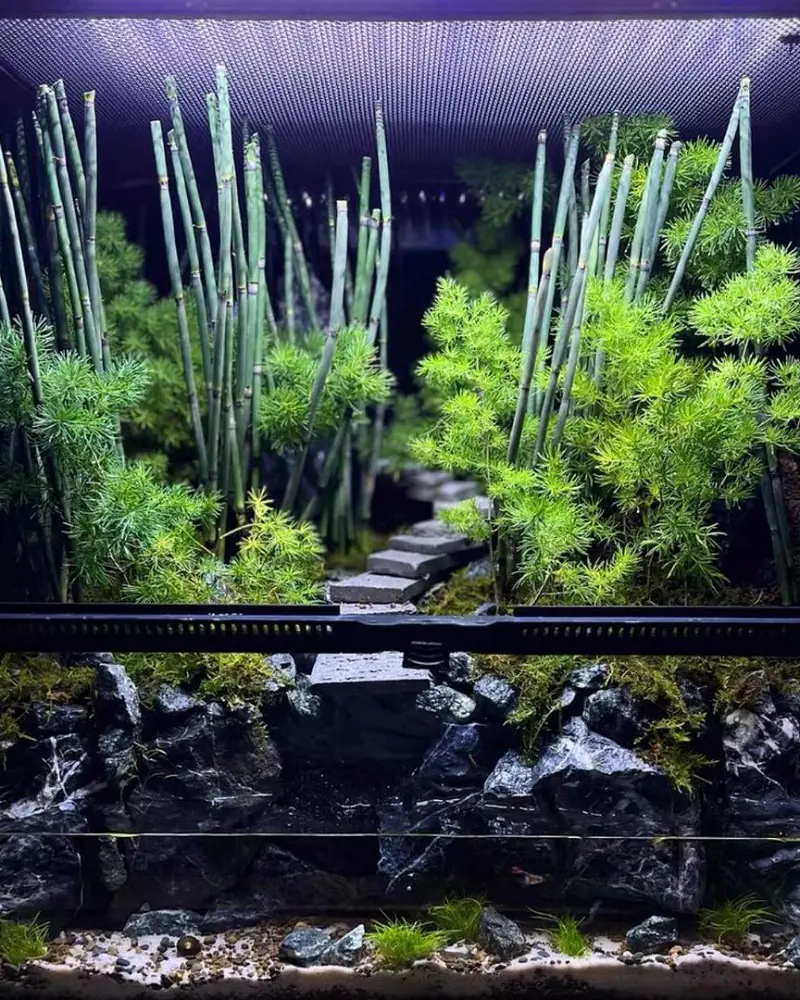Arrange the bamboo stems creatively to allow them to sway gently in the water, mimicking the peaceful ambiance of a real bamboo forest. Enhance the aesthetic appeal by incorporating soft, natural lighting that filters through the bamboo leaves.