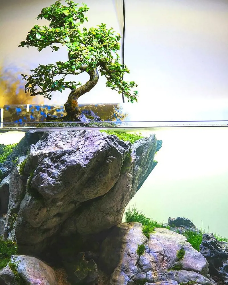 The details of the bonsai combined with the illusion of its suspended mid-water create a unique and visually stunning focal point.