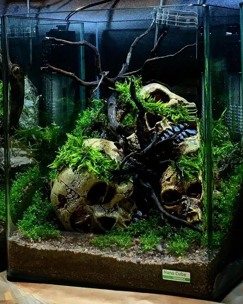 Strategically position the skulls amidst gravel or sandy substrate, allowing them to serve as mysterious underwater artifacts. Enhance the visual impact by incorporating subtle LED lighting to cast shadows and evoke an eerie ambiance for your fish to explore.
