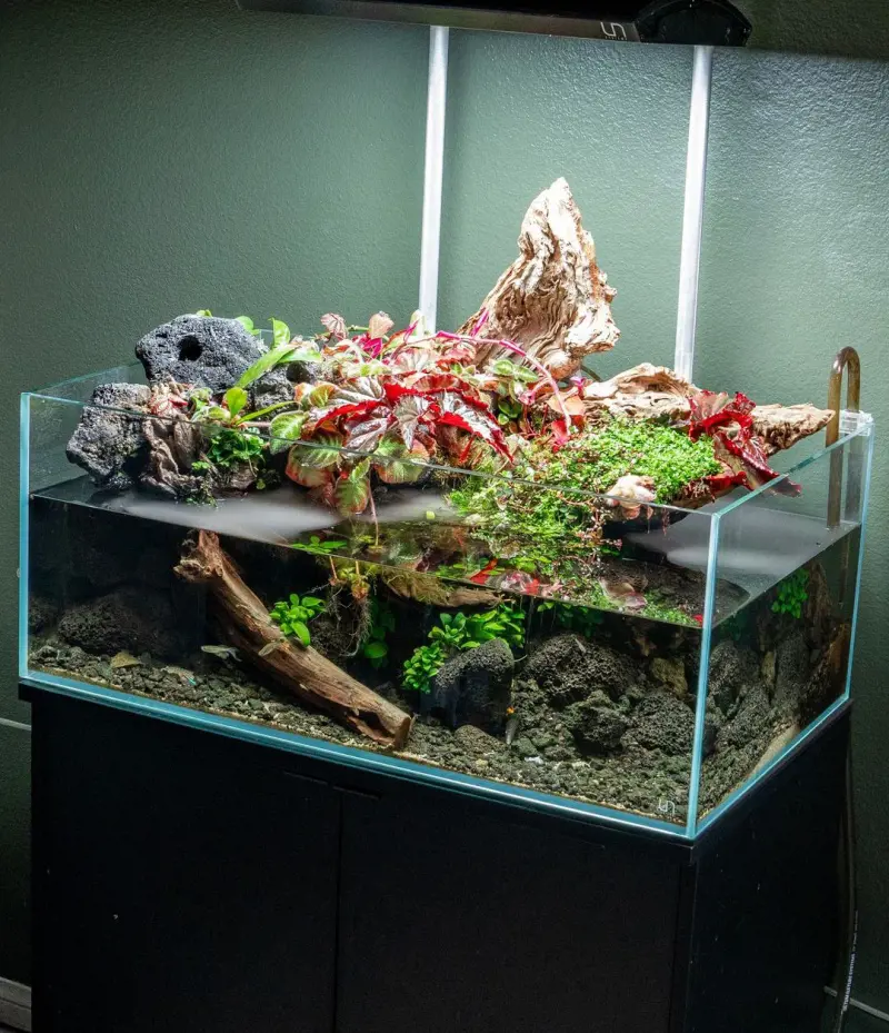 To achieve this unique setup, anchor the islands to the tank walls using a clear fishing line, giving the illusion of suspended landmasses. Further, enhance the visual appeal by incorporating live or artificial plants on the islands that provide interactive space for your fish to explore and swim.