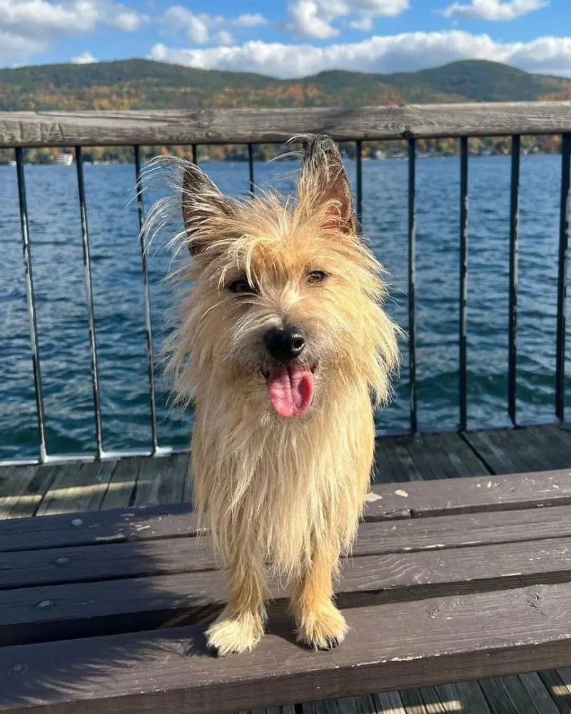 The Cairn Terrier is a small but sturdy dog with a compact and muscular body Their head is broad, with a strong muzzle and a pair of dark, alert eyes that reflect their intelligence and curiosity. One of its most recognizable features is its bushy eyebrows and beard.
