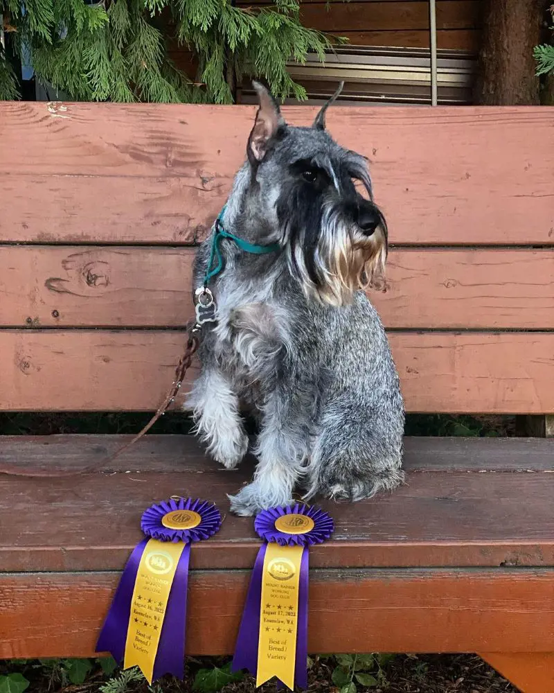 Their double coat is typically seen in solid black, salt and pepper, or black and silver colorations. Schnauzers have a moderate shedding coat that requires regular grooming, including brushing, stripping, and occasional trimming.